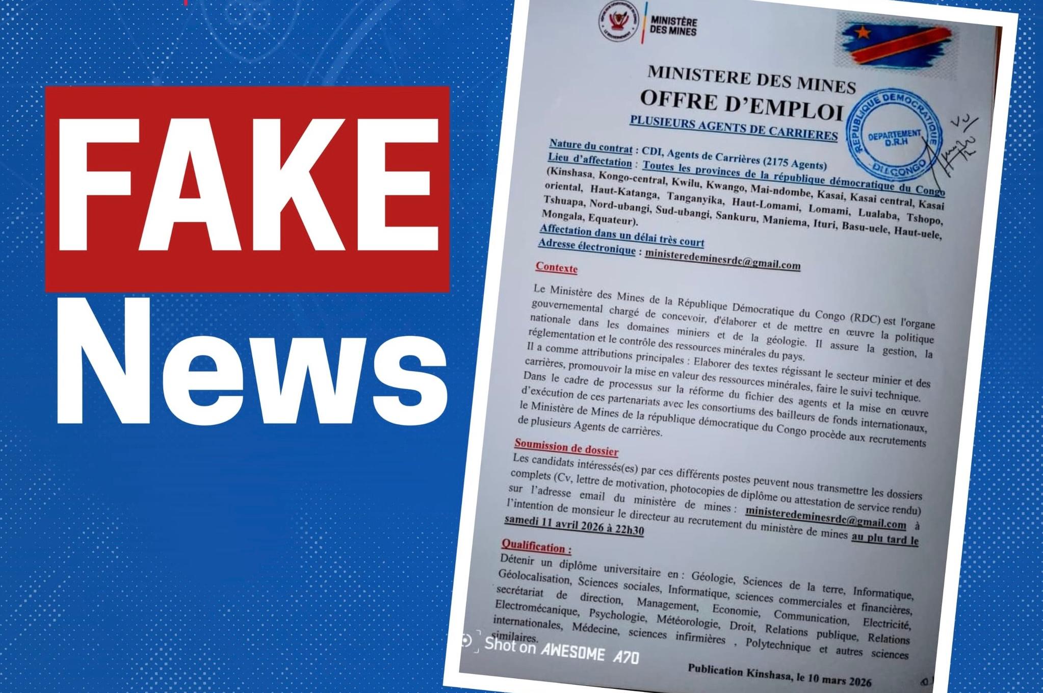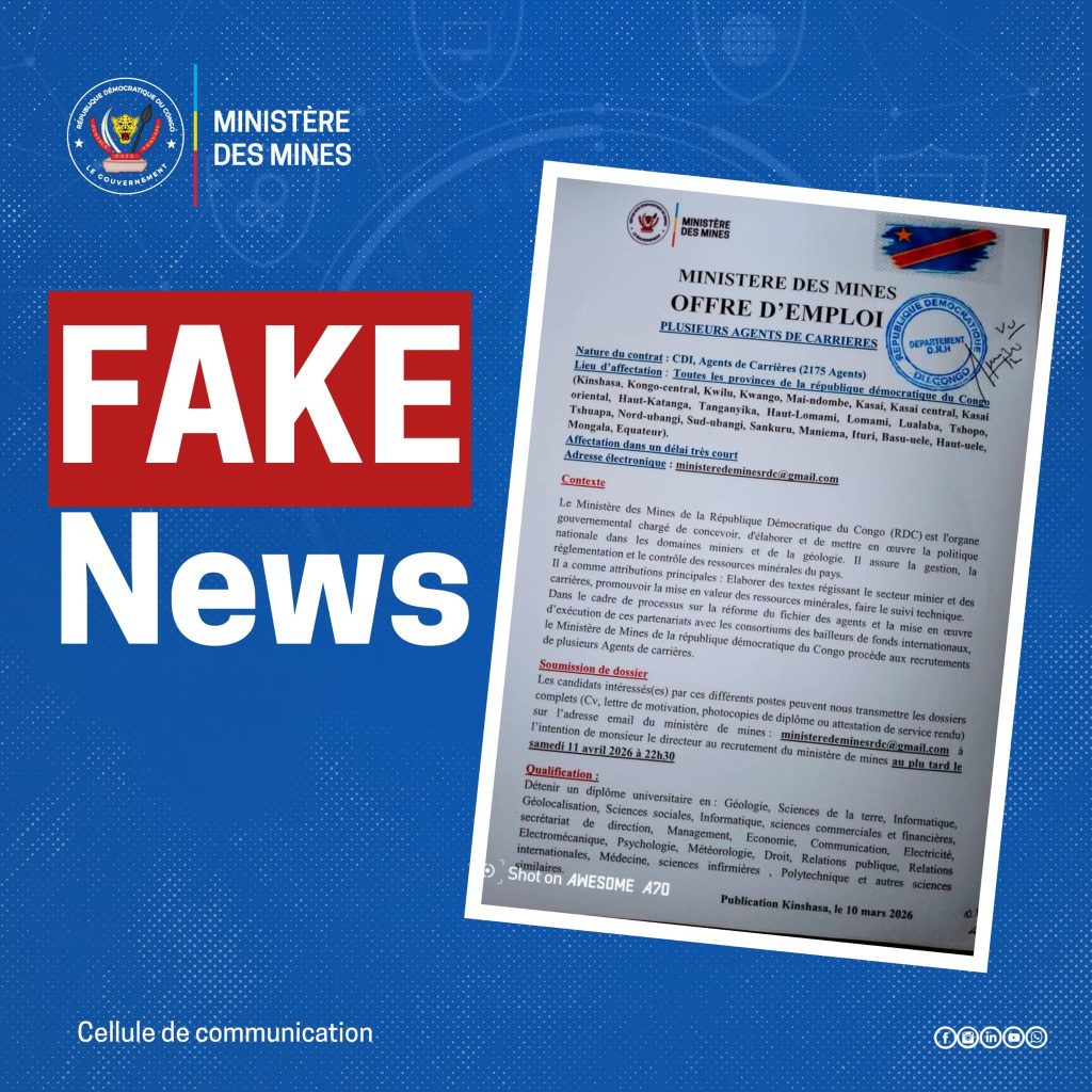 Dans un communiqué officiel publié ce samedi 21 mars, le ministère des Mines a tenu à démentir formellement les rumeurs circulant sur un prétendu recrutement d’agents des carrières. L’institution précise qu’aucune procédure d’embauche n’est actuellement engagée.